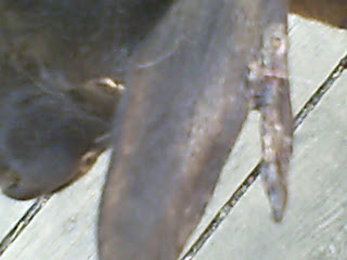 Torn ears cannot be stitched due to cartillage damage. I cleaned up the edges and applied balm to help it heal and keep the flies away. Now he really does look like a bandit!